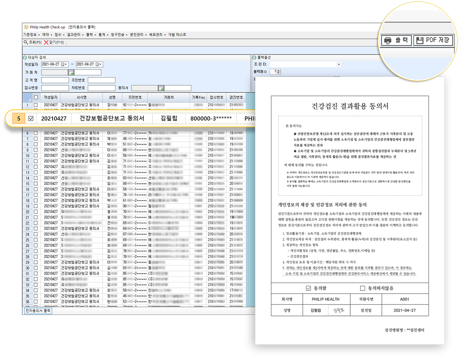 서명된 동의서는 EMR, CHECKUP SOLUTION 과 연동하여 바로 조회, 출력 가능